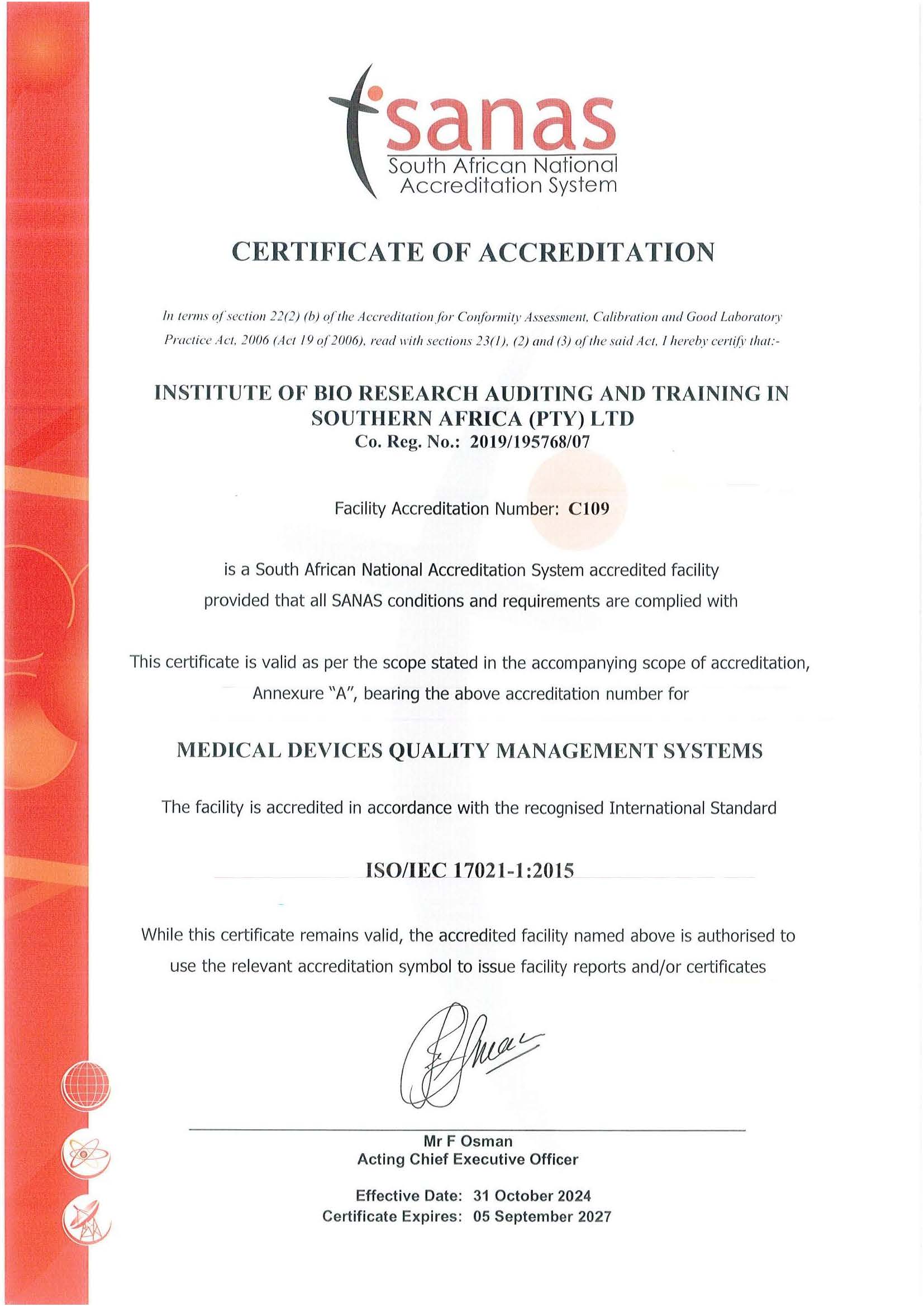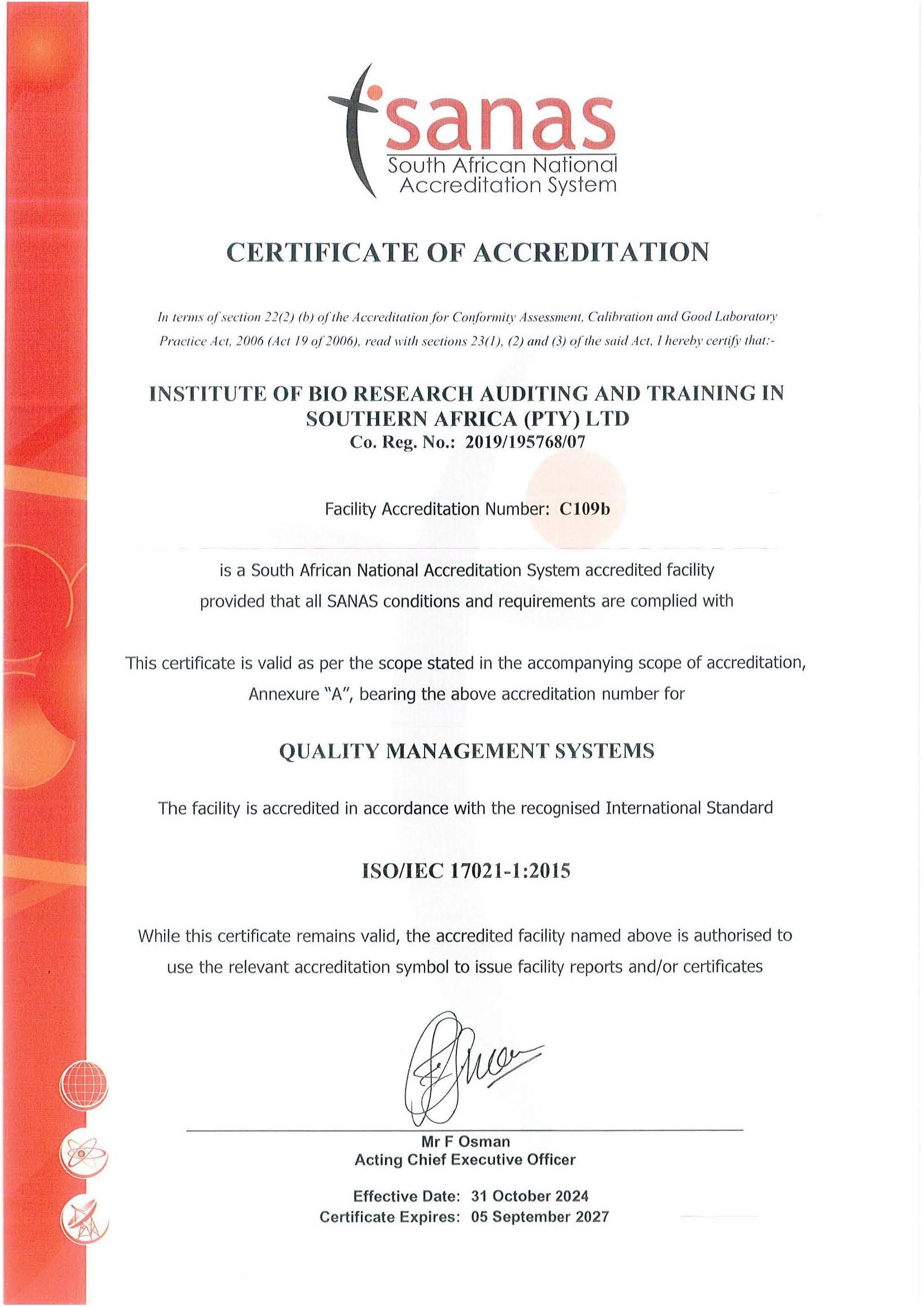 IBRATSA (Institute of Bio-Research Auditing and Training in Southern Africa) is a SANAS accredited certification body (ISO 13485:2016 Accreditation No: C109 and ISO 9001:2015 Accreditation No.: C109b) and recognized by SAHPRA as a conformity assessment body for medical devices. We specialize in ISO 13485:2016 and ISO 9001:2015 Quality Management Systems certification, offering independent and impartial auditing and certification services to manufacturers, distributors, and wholesalers.